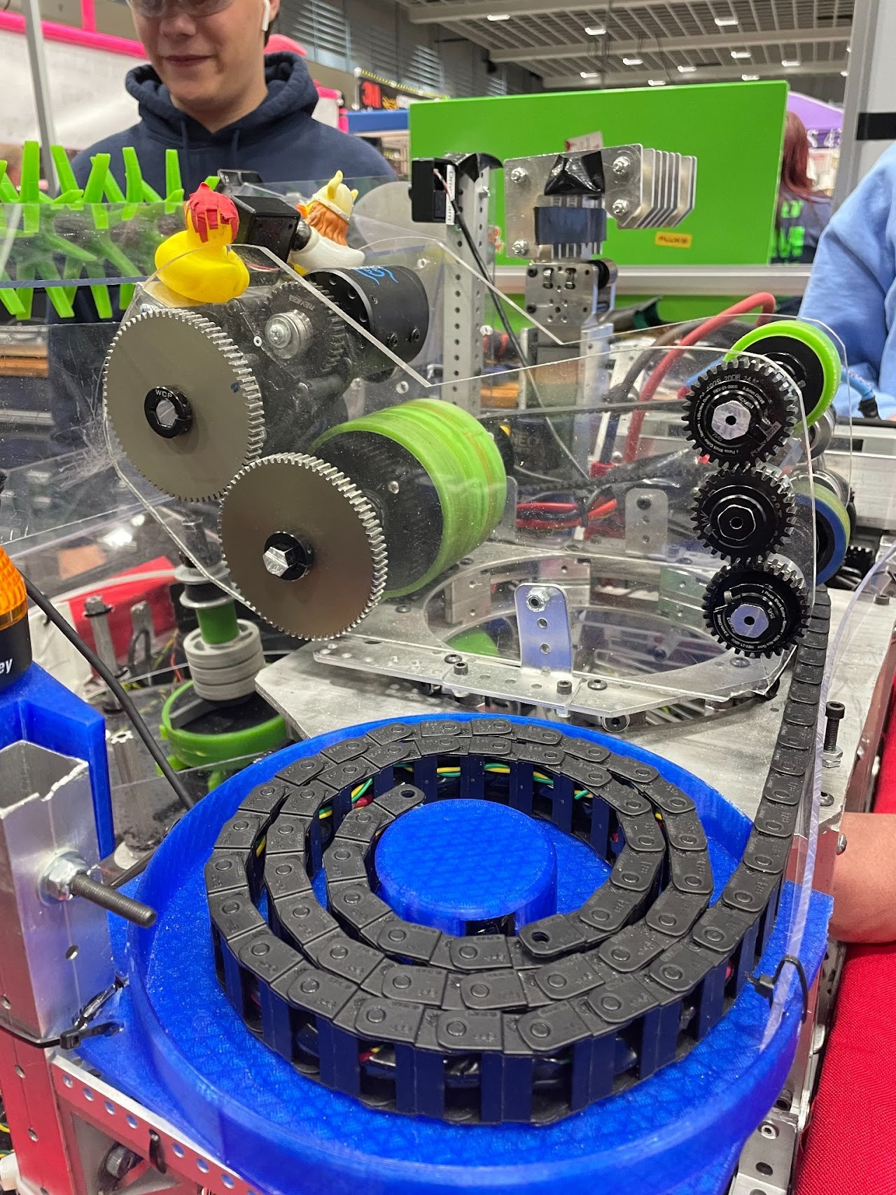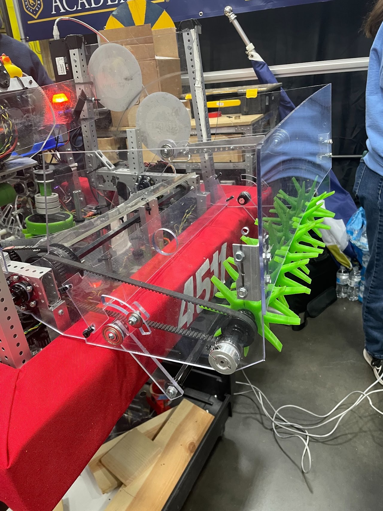 We have a ground intake that utilizes panels and wheels to feed into our washing machine. Our washing machine has a Christmas tree design that is some wheels stacked on top of each other.