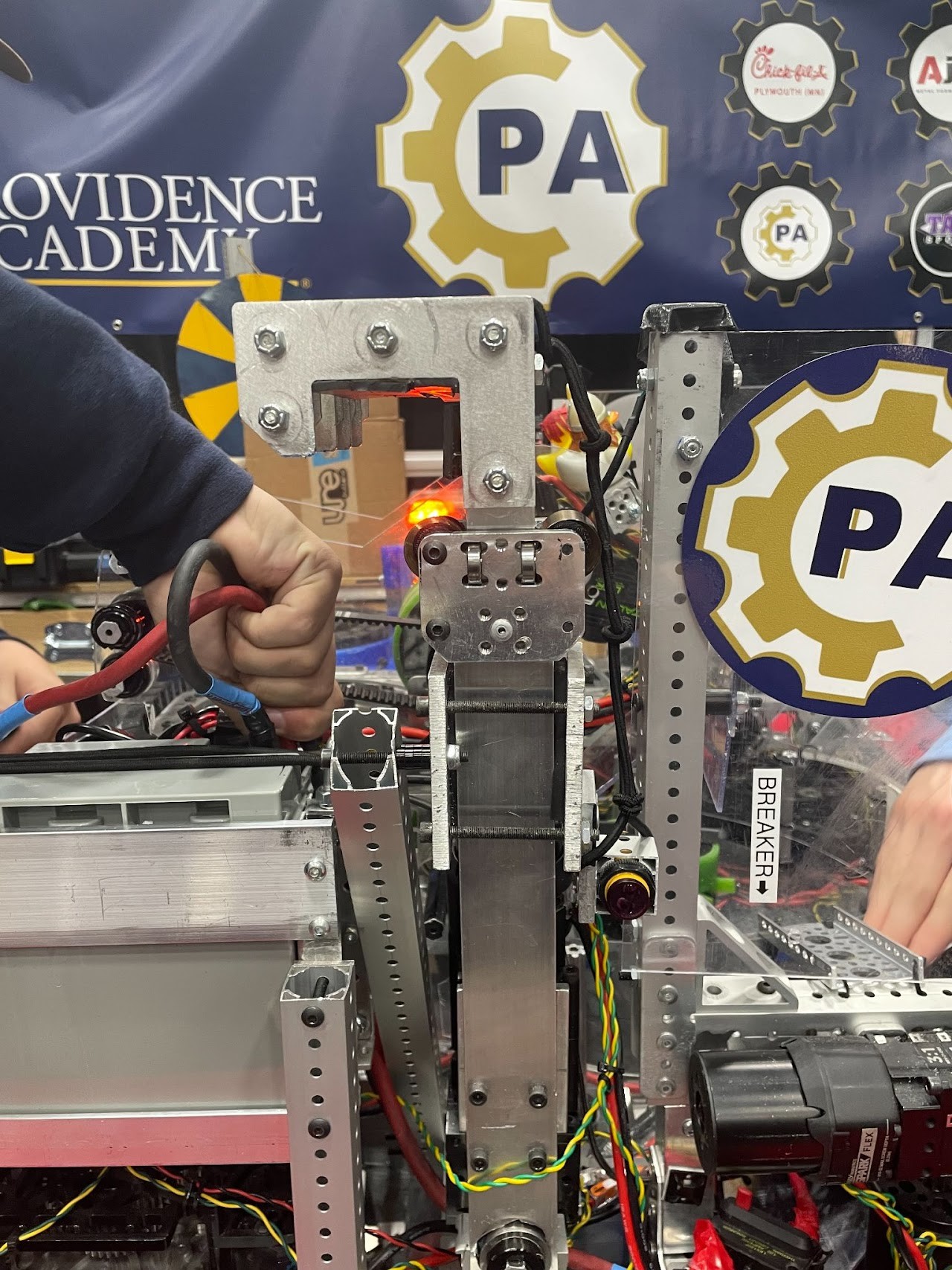 We use Kraken motors and fly wheels, on a pane of polycarbonate. It is in a turret system so our shoots rotates and uses a feeder ramp to launch the fuel.